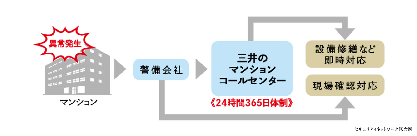 三井不動産レジデンシャルと三井不動産レジデンシャルサービス、警備会社が運営する「セキュリティネットワーク」を導入しています。火災・防犯などの個別監視、共用部分の設備機器の異常警報など、三井不動産レジデンシャルサービスの「三井のマンションコールセンター」が24時間365日体制で一括管理。緊急対応を要する事態が発生した場合、三井不動産レジデンシャルサービスは専門会社への出動依頼や現場急行の指示など、必要な措置を速やかに行い、警備会社は警報受信後直ちに状況に応じた適切な対処で皆様の安全を守ります。