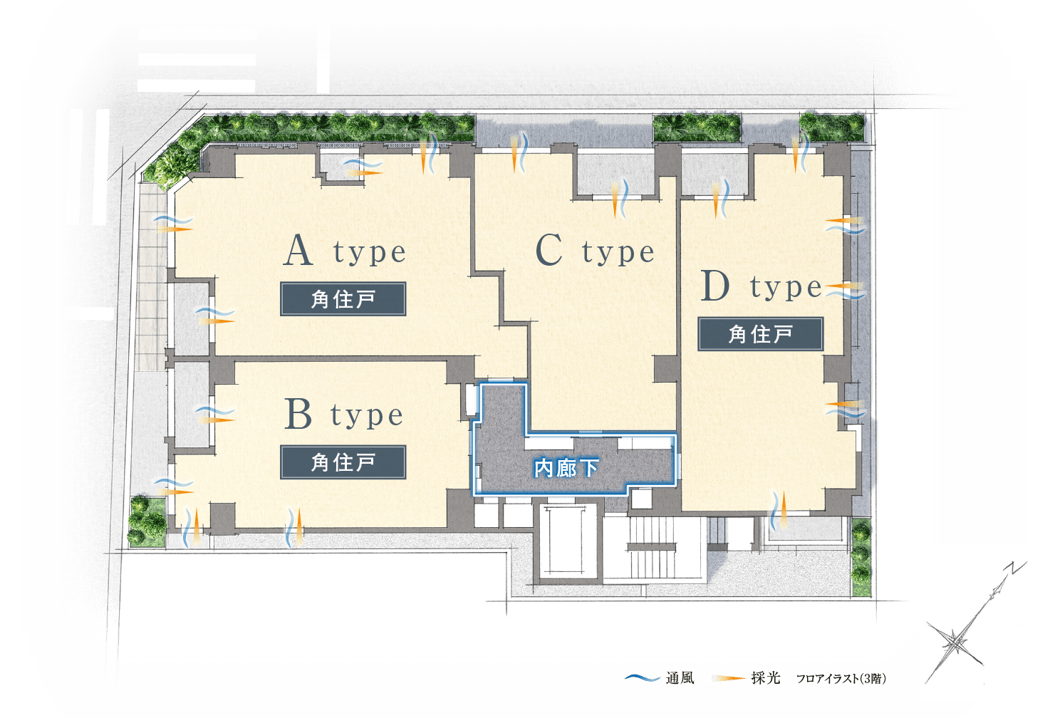 上質な空間を演出した内廊下を採用。外部に面していないため、雨や風の影響を受けることもなく快適です。また、住戸の窓は共用廊下側に面しておらず、プライベート面でも安心です。
