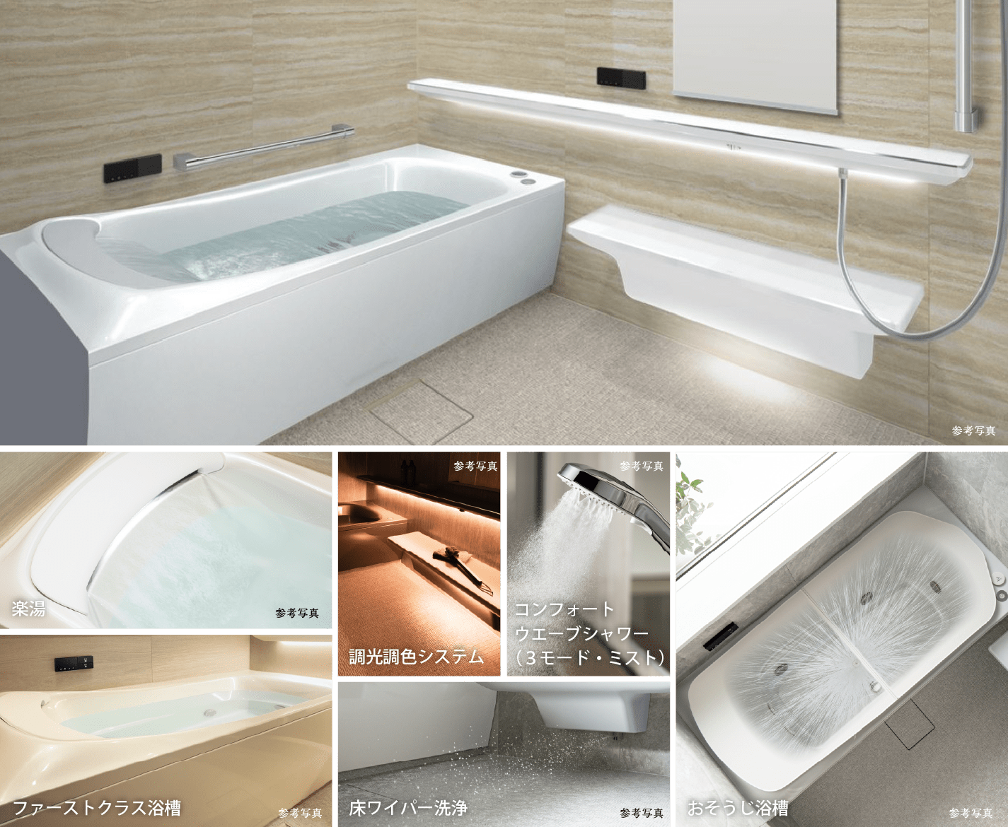 体を優しく包む「ファーストクラス浴槽」、大流量のお湯で肩と腰を温める「楽湯」、寛ぎを深める「調光調色システム」等を備えたプレミアムなバスユニットです。