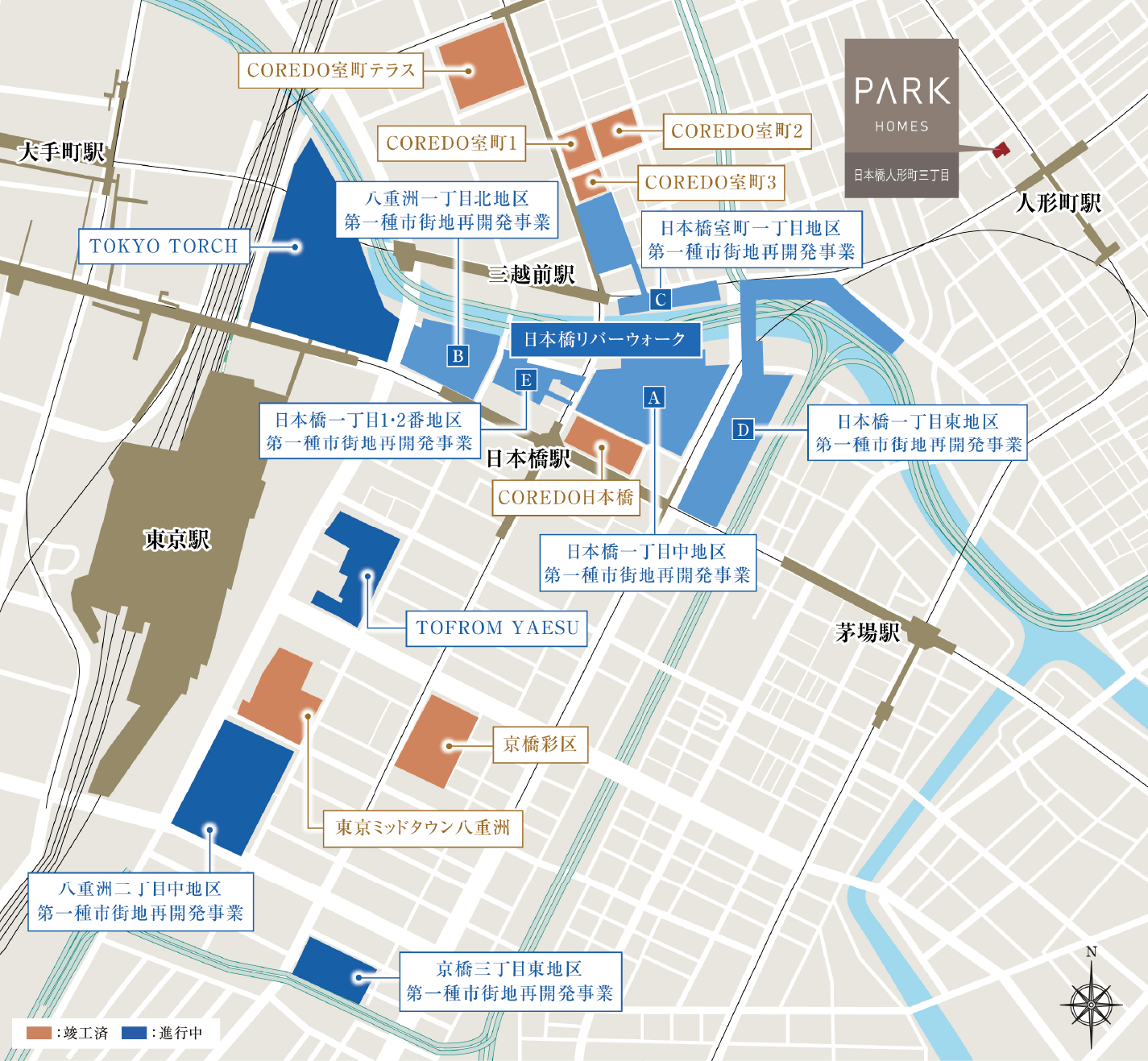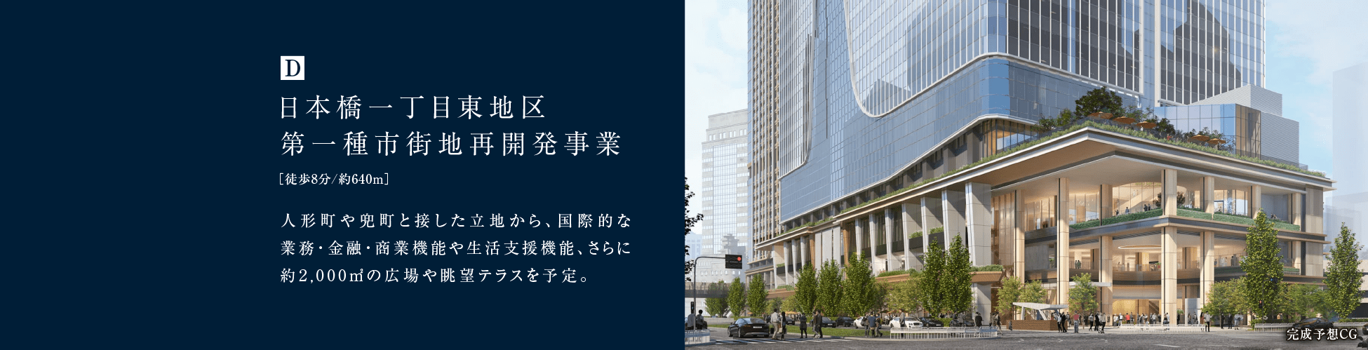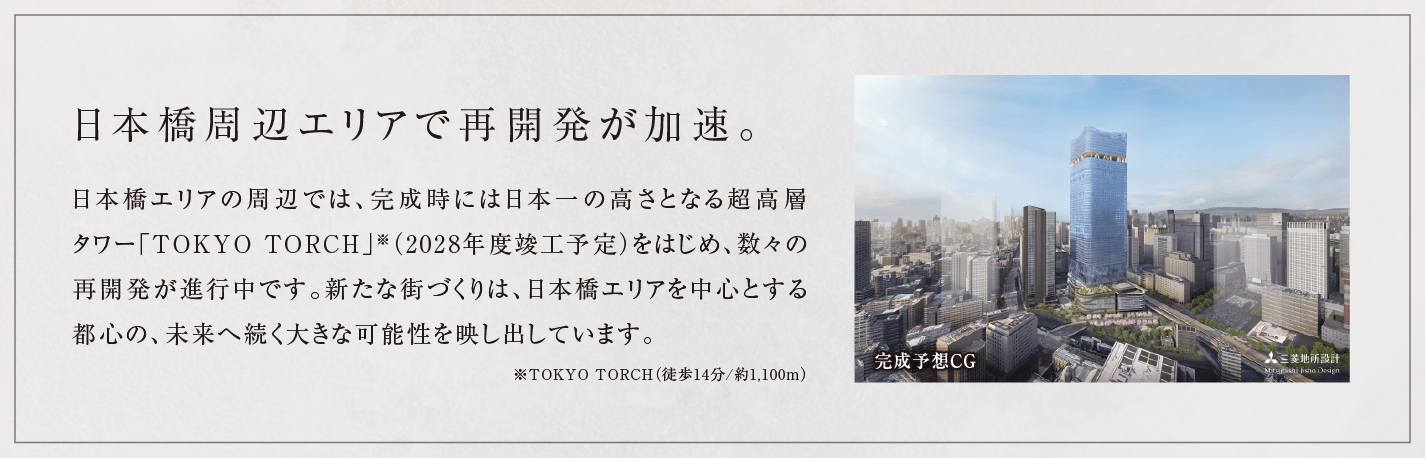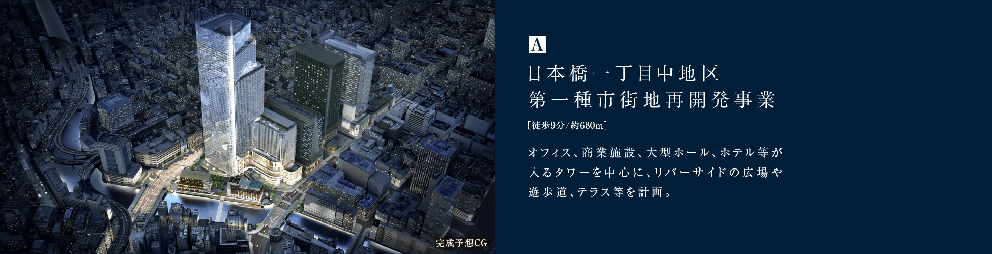 ※日本橋一丁目中地区第一種市街地再開発事業(現況:工事中)完成時期2026年3月末予定。(徒歩9分/約680m) ※八重洲一丁目北地区第一種市街地再開発事業(現況:工事中)完成時期南街区2030年度予定、北街区2035年度予定。(徒歩13分/約990m) ※日本橋室町一丁目地区第一種市街地再開発事業(現況:計画決定済)完成時期2031年予定。(徒歩9分/約680m) ※日本橋一丁目東地区第一種市街地再開発事業(現況:計画決定済)完成時期2038年予定。(徒歩8分/約640m) ※日本橋一丁目1・2番地区第一種市街地再開発事業(現況:計画決定済)完成時期2034年予定。(徒歩12分/約890m) ※CORED日本橋(現況:竣工済)(徒歩12分/約930m) ※CORED室町1(現況:竣工済)(徒歩10分/約740m) ※CORED室町2(現況:竣工済)(徒歩9分/約670m) ※CORED室町3(現況:竣工済)(徒歩9分/約710m) ※CORED室町テラス(現況:竣工済)(徒歩13分/約970m) ※TOKYO TORCH(現況:工事中(A棟・先行整備広場・親水空間完成済み)完成時期2028年度予定。(徒歩14分/約1,100m) ※TOFROM YAESU(現況:工事中)完成時期2026年予定。(徒歩17分/約1,300m) ※東京ミッドタウン八重洲(現況:竣工済)(約1,580m) ※八重洲二丁目中地区第一種市街地再開発事業(現況:工事中)完成時期2029年1月末予定。(約1,670m) ※京橋彩区(現況:竣工済)(徒歩19分/約1,450m) ※京橋三丁目東地区第一種市街地再開発事業(現況:計画決定済)完成時期2030年度予定。(約1,790m) ※各事業の完成は遅れる場合があります。