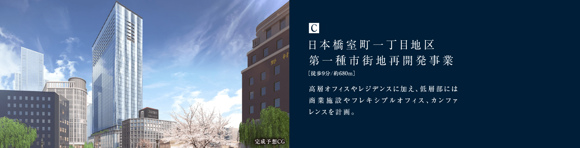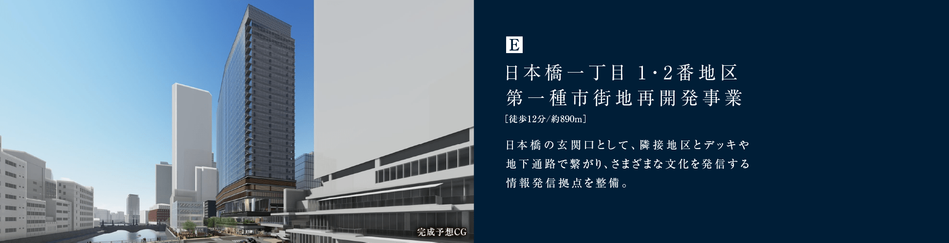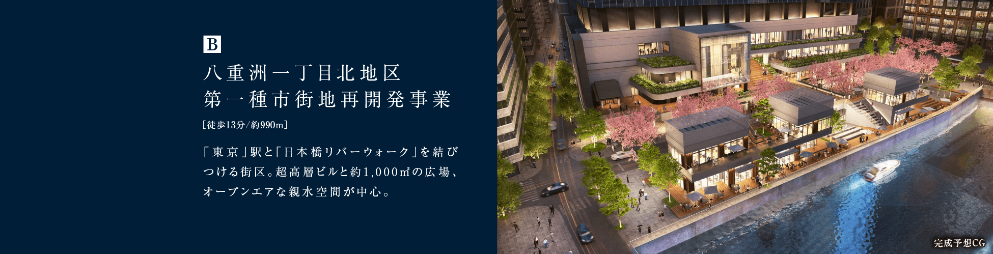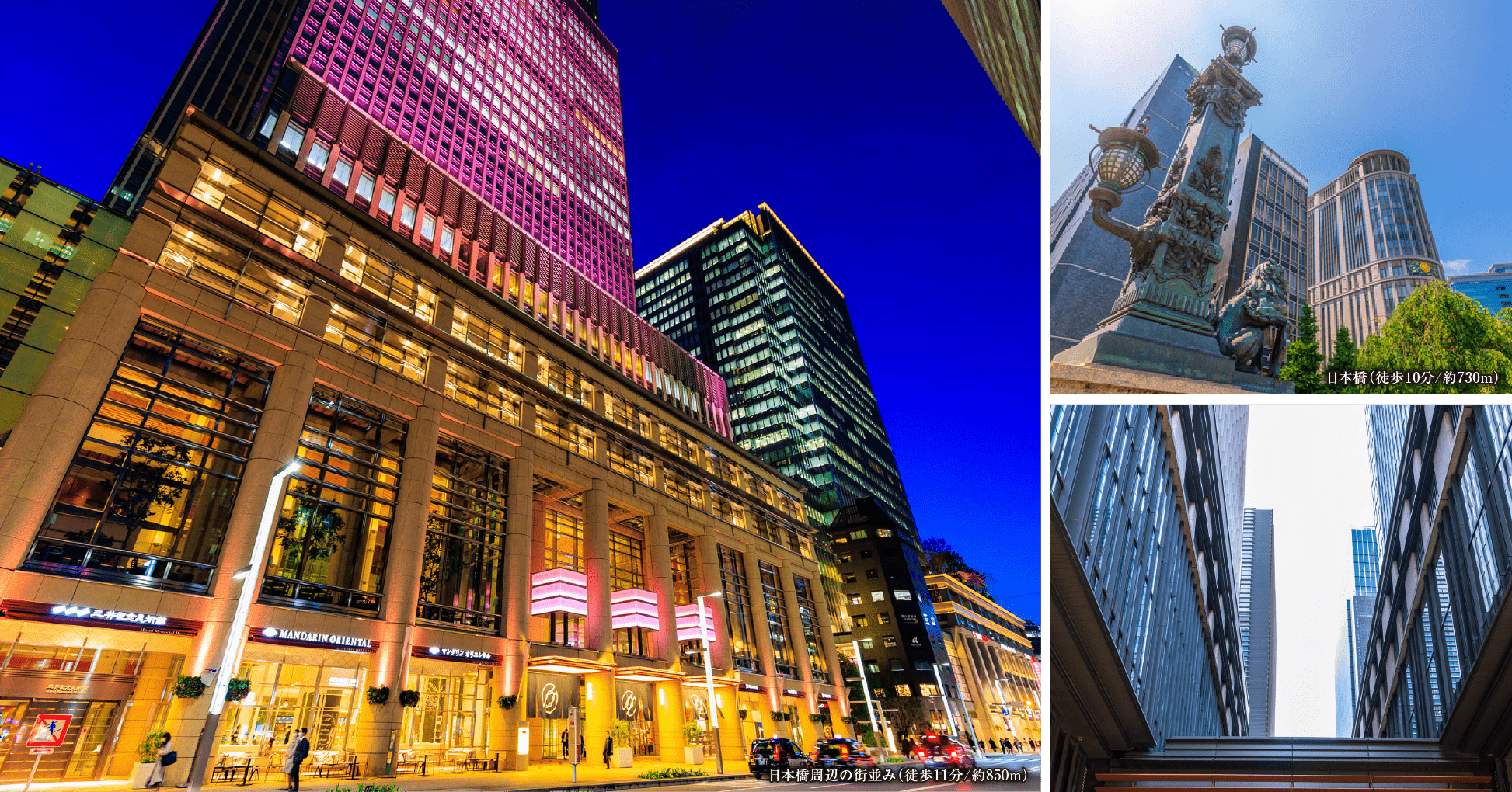 ※日本橋一丁目中地区第一種市街地再開発事業(現況:工事中)完成時期2026年3月末予定。(徒歩9分/約680m) ※八重洲一丁目北地区第一種市街地再開発事業(現況:工事中)完成時期南街区2030年度予定、北街区2035年度予定。(徒歩13分/約990m) ※日本橋室町一丁目地区第一種市街地再開発事業(現況:計画決定済)完成時期2031年予定。(徒歩9分/約680m) ※日本橋一丁目東地区第一種市街地再開発事業(現況:計画決定済)完成時期2038年予定。(徒歩8分/約640m) ※日本橋一丁目1・2番地区第一種市街地再開発事業(現況:計画決定済)完成時期2034年予定。(徒歩12分/約890m) ※CORED日本橋(現況:竣工済)(徒歩12分/約930m) ※CORED室町1(現況:竣工済)(徒歩10分/約740m) ※CORED室町2(現況:竣工済)(徒歩9分/約670m) ※CORED室町3(現況:竣工済)(徒歩9分/約710m) ※CORED室町テラス(現況:竣工済)(徒歩13分/約970m) ※TOKYO TORCH(現況:工事中(A棟・先行整備広場・親水空間完成済み)完成時期2028年度予定。(徒歩14分/約1,100m) ※TOFROM YAESU(現況:工事中)完成時期2026年予定。(徒歩17分/約1,300m) ※東京ミッドタウン八重洲(現況:竣工済)(約1,580m) ※八重洲二丁目中地区第一種市街地再開発事業(現況:工事中)完成時期2029年1月末予定。(約1,670m) ※京橋彩区(現況:竣工済)(徒歩19分/約1,450m) ※京橋三丁目東地区第一種市街地再開発事業(現況:計画決定済)完成時期2030年度予定。(約1,790m) ※各事業の完成は遅れる場合があります。