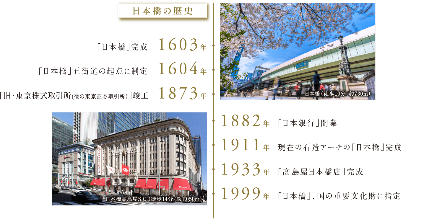 江戸時代、商業と文化の中心地として繁栄を謳歌した日本橋。その役割は現代に引き継がれ、金融の中枢「日本銀行本店」や老舗百貨店「三越本店」「日本橋高島屋」を街の顔として、日本の金融・商業・産業を牽引。その求心力は時代の流れの中でも変わることがありません。