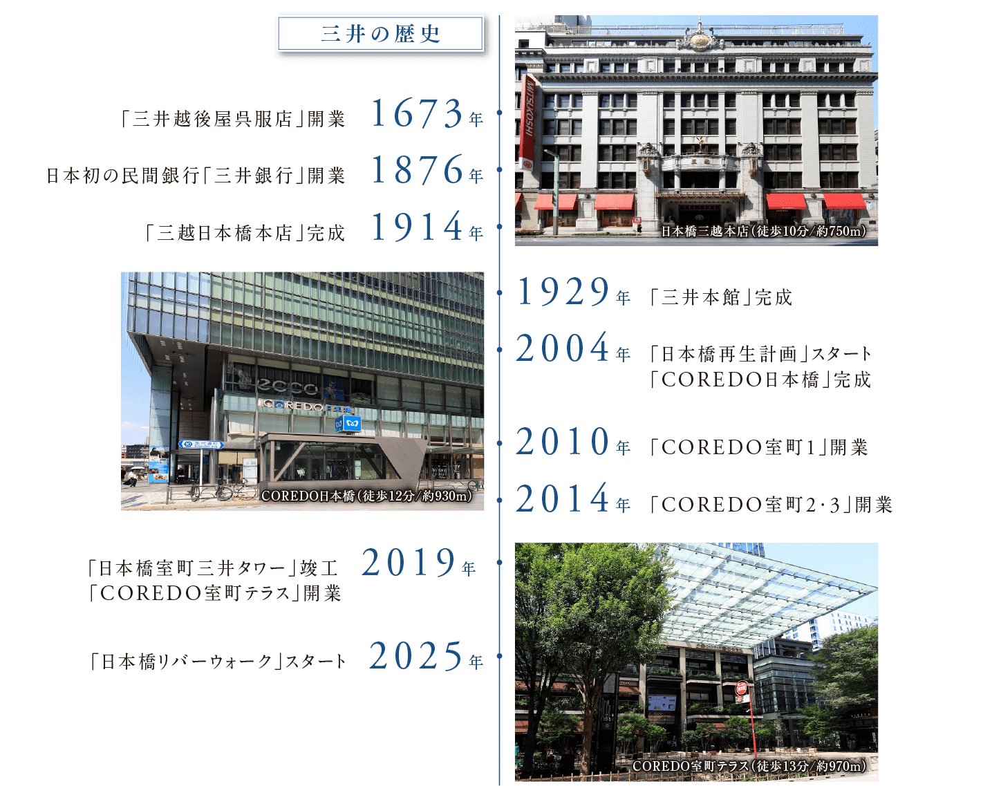 三井グループは江戸時代にそのルーツとなる呉服店をこの地に構えてから300余年、日本橋エリアに本拠を構え、共に歩んできました。