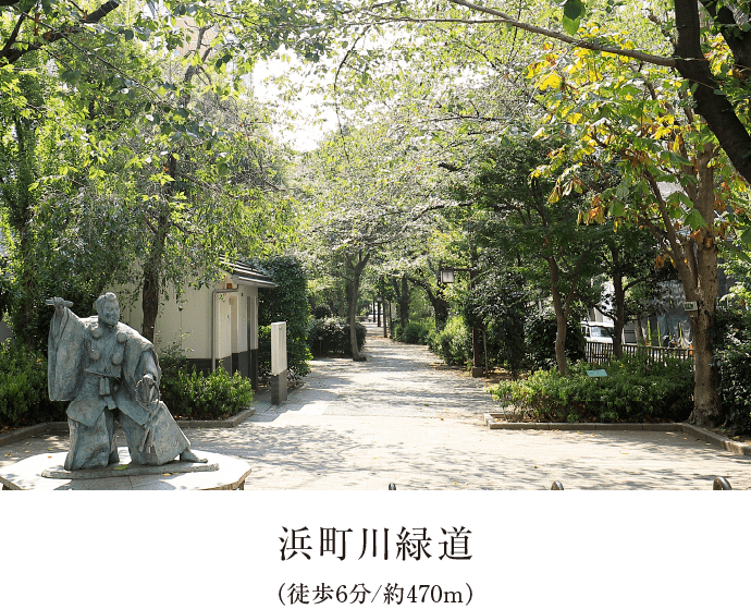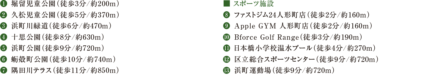 中央区立公園中最大の面積を誇る徒歩9分の「浜町公園」。四季の移ろいを感じながら芝生で憩い、デイキャンプ場ではバーベキューも愉しめます。また園内の「中央区立スポーツセンター」では、温水プール、トレーニングルーム、ゴルフ練習場等を利用可能。さらに花見を愉しめる「浜町川緑道」や川沿いに散策路が約12km続く「隅田川テラス」など、都心にありながら豊かな自然を満喫できます。