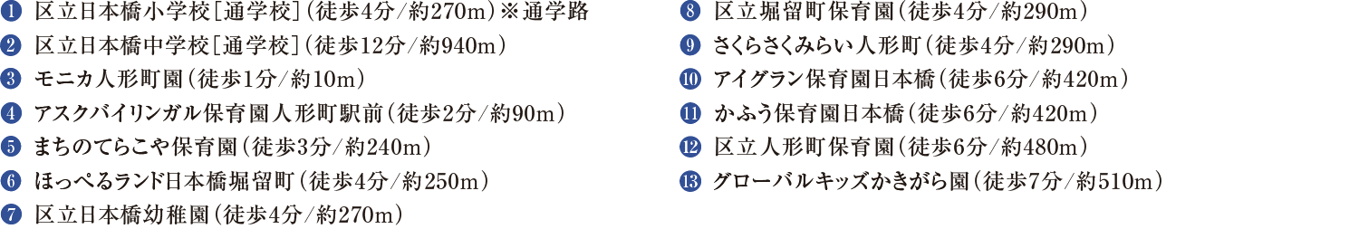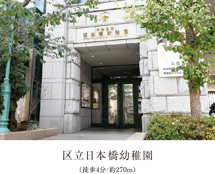 「日本橋小学校」へ徒歩4分、「区立日本橋幼稚園」へ徒歩4分。さらに保育園は徒歩7分圏内に13ヶ所。