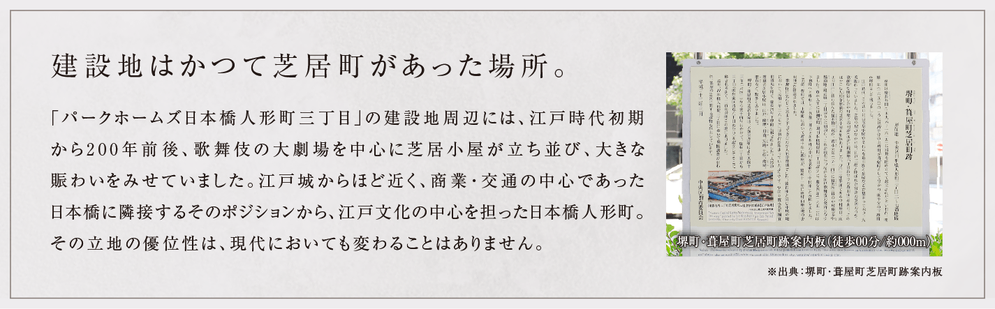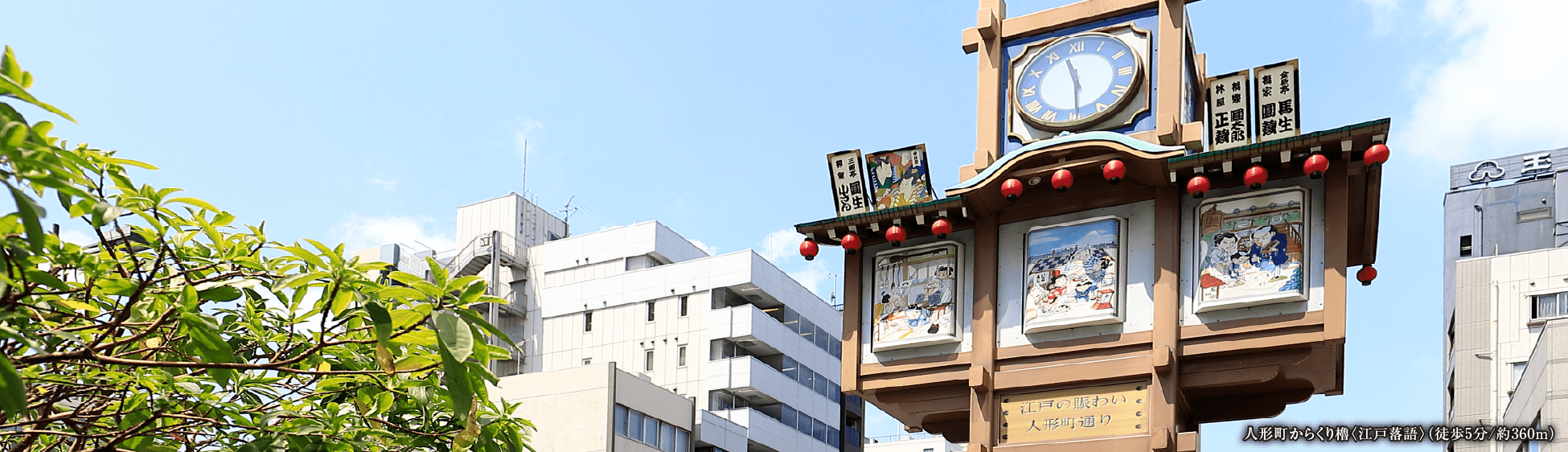 江戸時代、歌舞伎の中心地として名を馳せた日本橋人形町。人形町の地名も人形浄瑠璃に関わる職人の町であったことにちなんでいます。そんな背景から、この街には伝統的な技術を継承する職人や企業、百年以上続く老舗飲食店が数多く健在。都心ならではの生活利便性に加え、歴史がもたらす地に足の付いた雰囲気もまた、日本橋人形町独自のものです。