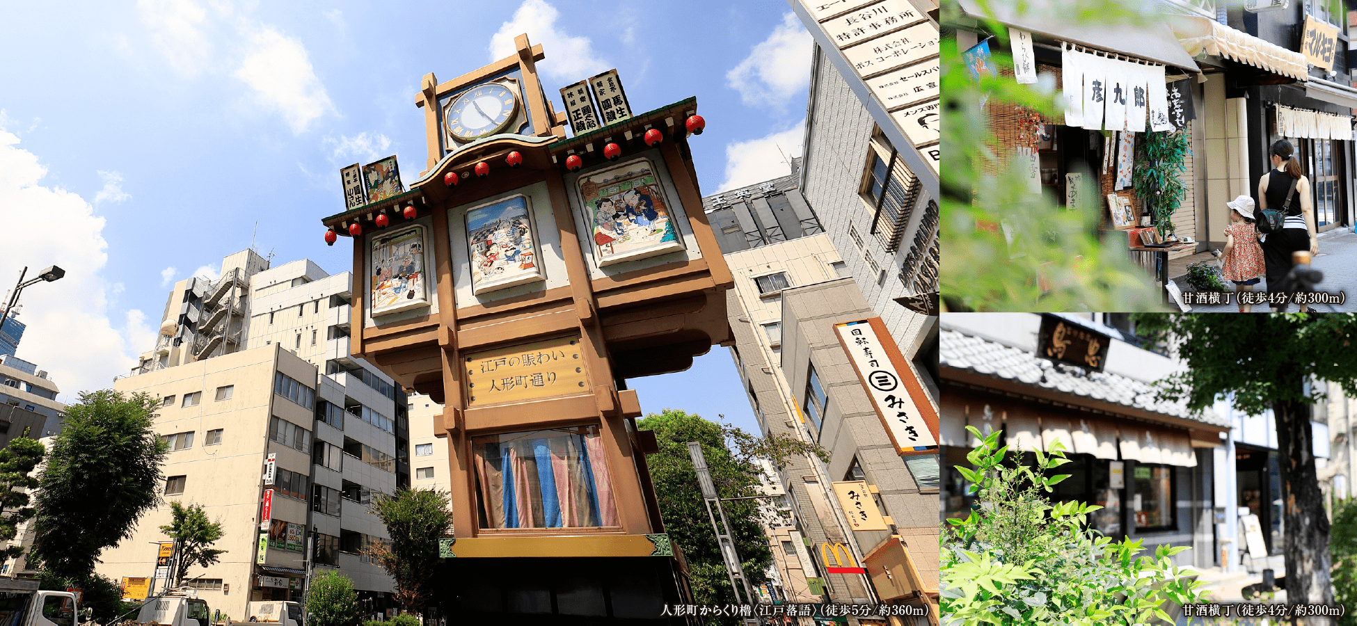 日本橋人形町の活気の中心である「甘酒横丁」(徒歩4分/約300m)と「人形町商店街」(徒歩1分/約50m)。