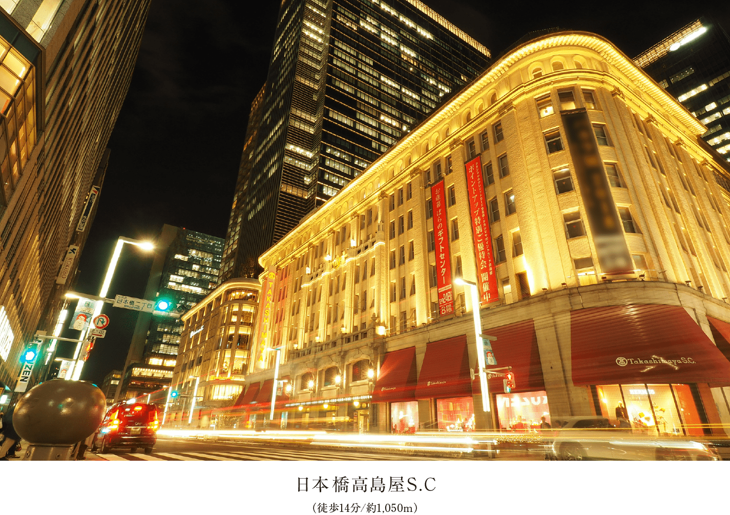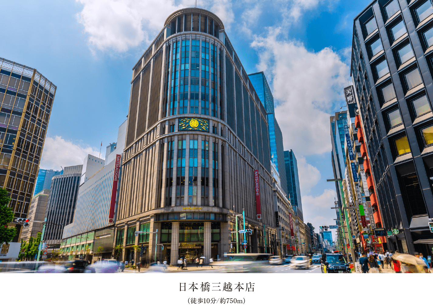「日本橋三越本店」と「日本橋高島屋」、日本橋エリアのふたつの老舗百貨店が徒歩圏内。