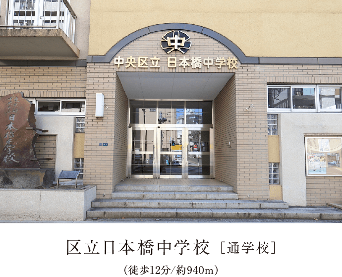 日本橋地区にある唯一の公立中学校。本校舎は改築中で、令和10年度まで「浜町公園」内の仮校舎が使用されます。
