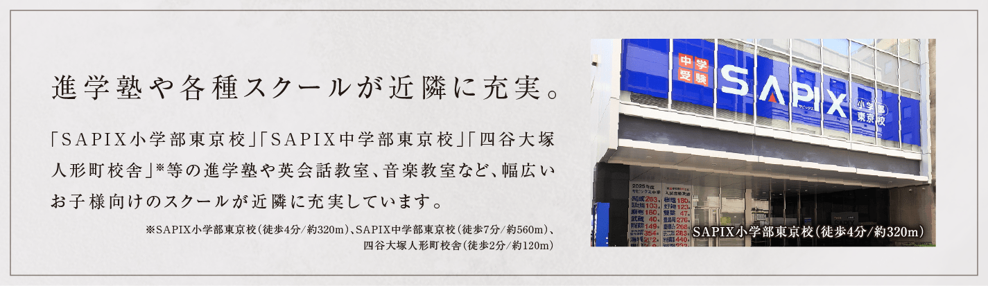「日本橋小学校」へ徒歩4分、「区立日本橋幼稚園」へ徒歩4分。さらに保育園は徒歩7分圏内に13ヶ所。通学の負担が少なく、選択肢も多い、子育てに適した生活環境です。