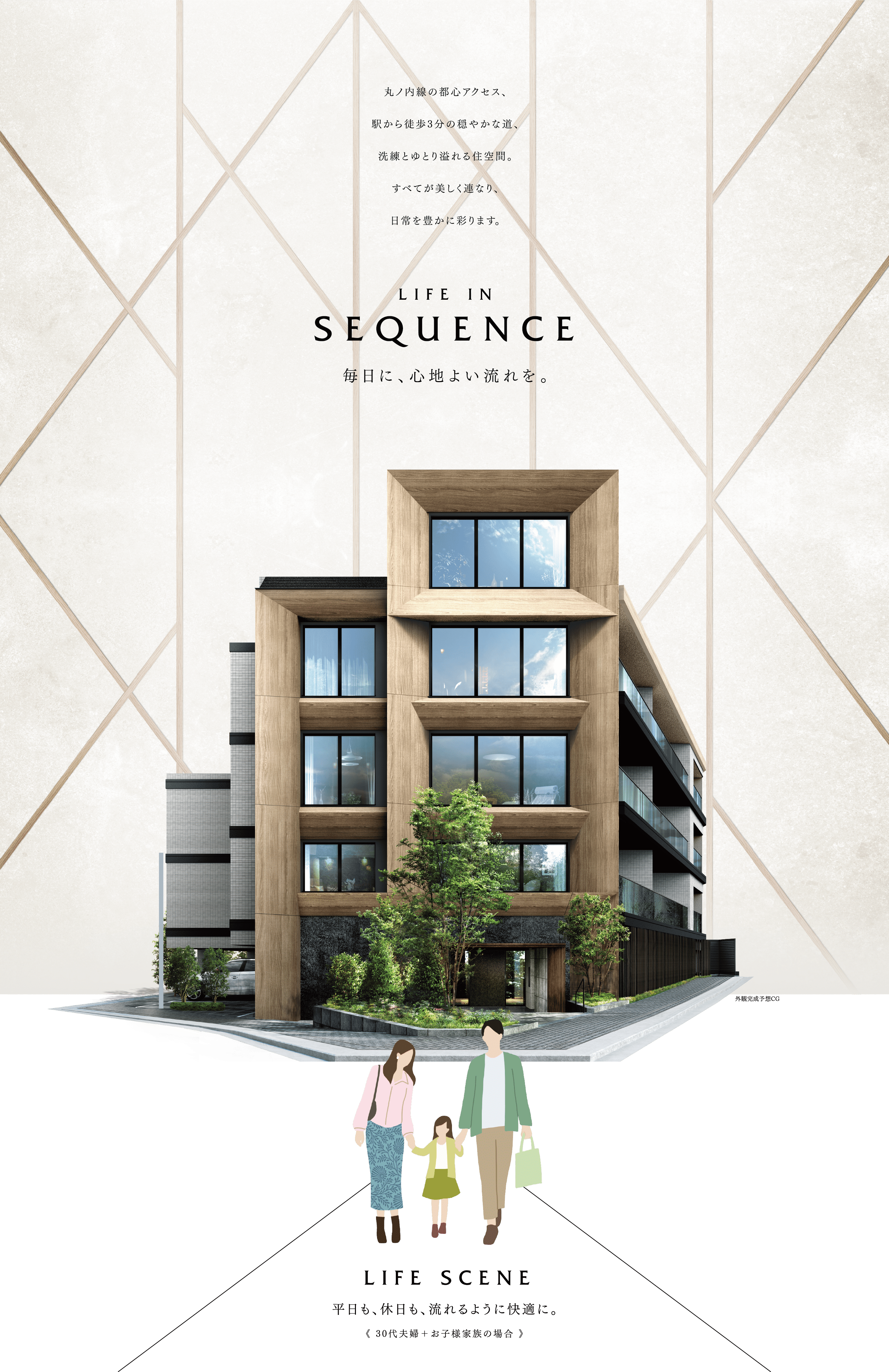※掲載の完成予想CGは計画段階の図面を基に描き起こしたもので形状・色等は実際とは異なります。この完成予想図で表現されている植栽は竣工から初期の生育期間を経た状態のものを想定しており、竣工時には植物の生育を見込んで必要な間隔をとって植えています。家具・調度品等は販売価格に含まれません。この完成予想図は敷地のみを表現しています。
