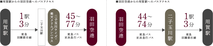 ※掲載の分数は電車・バス利用の所要時間です。※「二子玉川」駅までの所要時間/通勤時3分:東急田園都市線利用[日中平常時2分:東急田園都市線利用]※掲載のバスの所要時間は、行きは二子玉川ライズ・楽天クリムゾンハウスから羽田空港第2、第1、第3ターミナルへの所要時間、帰りは羽田空港第3、第2、第1ターミナルから二子玉川駅への所要時間となります。※バスの所要時間は道路状況により異なります。※出典:東急バスHP