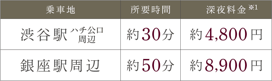 ※1.時間帯/22:00~翌5:00 ※所要時間・料金は、時間帯・交通事情により異なる場合があります。高速料金は含まれておりません。※上記の金額は、各区域の距離制運賃制度に基づき独自に算出した物です(時間帯による通行禁止、一方通行等は考慮されておりません)。※出典:タクシーサイト料金検索システム