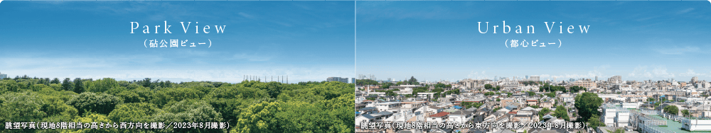 ※掲載の外観完成予想CGは、現地より直線距離約30mからの写真(2025年9月撮影)に建物CGを合成したもので実際とは異なります。建物CGは、計画段階の図面を基に描き起こしたもので実際とは異なります。なお、形状の細部、設備機器等は表現しておりません。また、表現されている植栽は初期の育成期間を経た状態のものを想定して描いており、竣工時は植物の育成を見込んで必要な間隔をとって植えております。家具・調度品等は販売価格に含まれておりません。※掲載の現地眺望写真は現地8階相当の高さから西方向・東方向を撮影(2023年8月)したもので実際の住戸からの眺望とは異なります。眺望・景観は各階・各住戸により異なり、今後の周辺環境の変化に伴い将来にわたって保証されるものではありません。※掲載の環境写真は2025年9月に撮影したものです。
