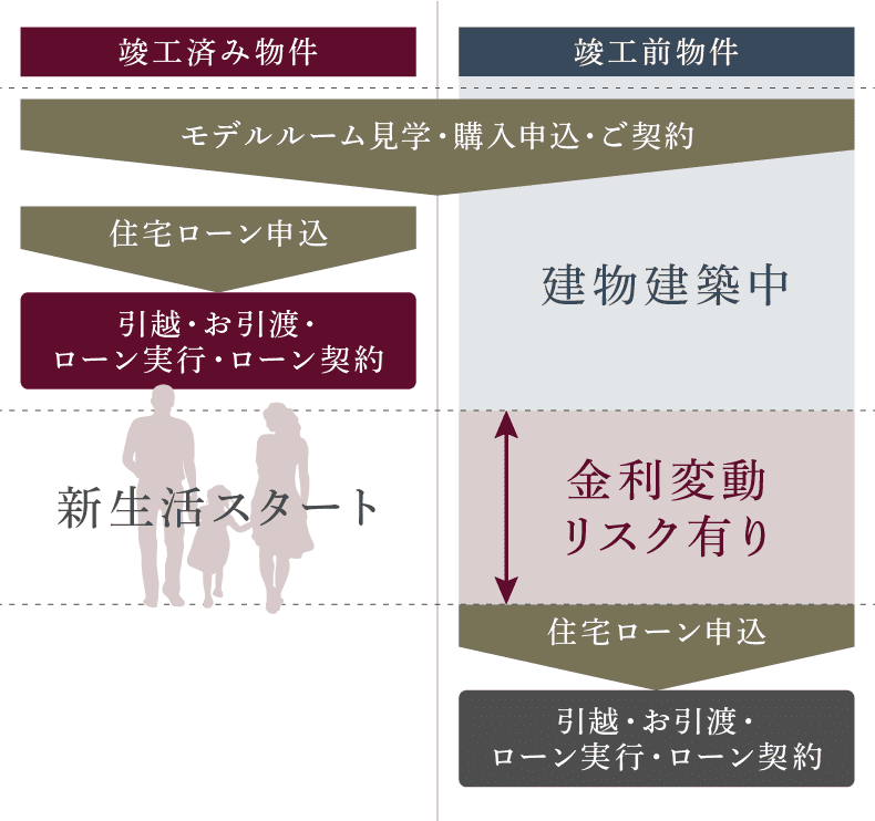 住宅ローンを利用する場合、住戸引渡し月の金利が適用、契約からお引渡しまで期間が空いてしまうと、契約時点では低金利でも、引渡し時点では金利が変動している可能性もあります。竣工済みマンションは金利の変動リスクが少なく、支払い計画も立てやすくなります。