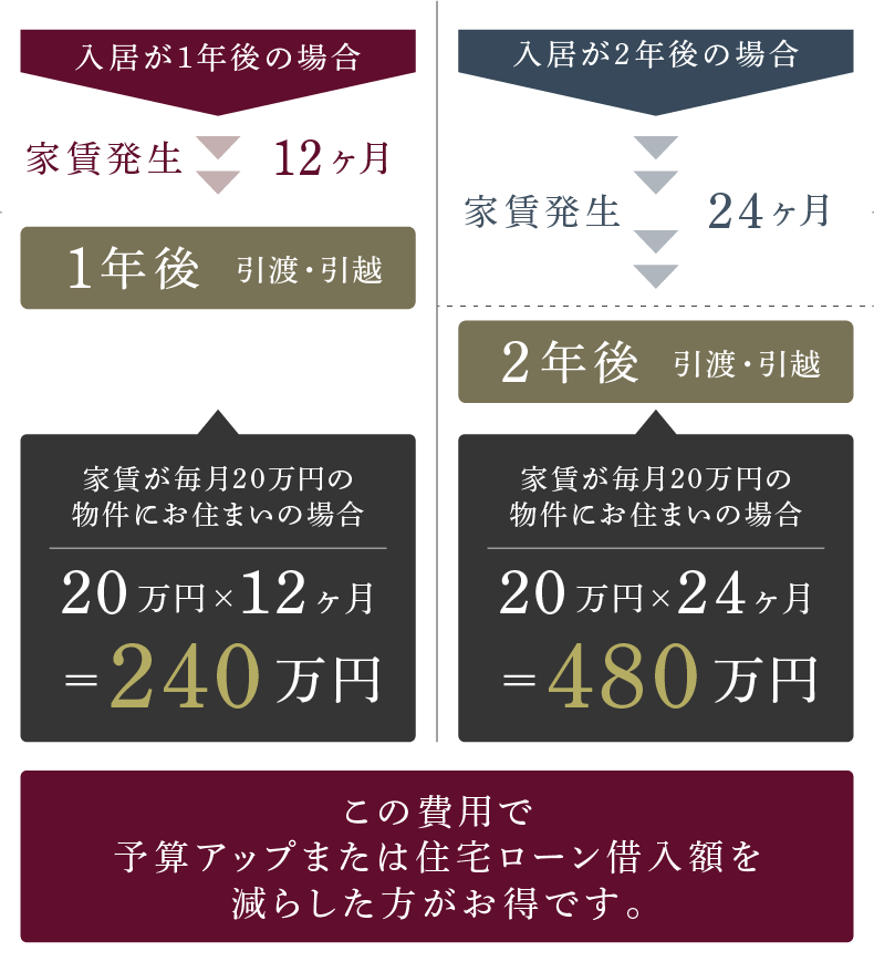 竣工前物件の場合は契約手続きが済んでも、入居までには時間を要します。賃貸物件から住み替えの場合は、家賃の支払いや賃貸期間の更新が必要なケースも。竣工済みマンションは、購入から入居までスムーズなので、費用を最小限に抑えることができます。