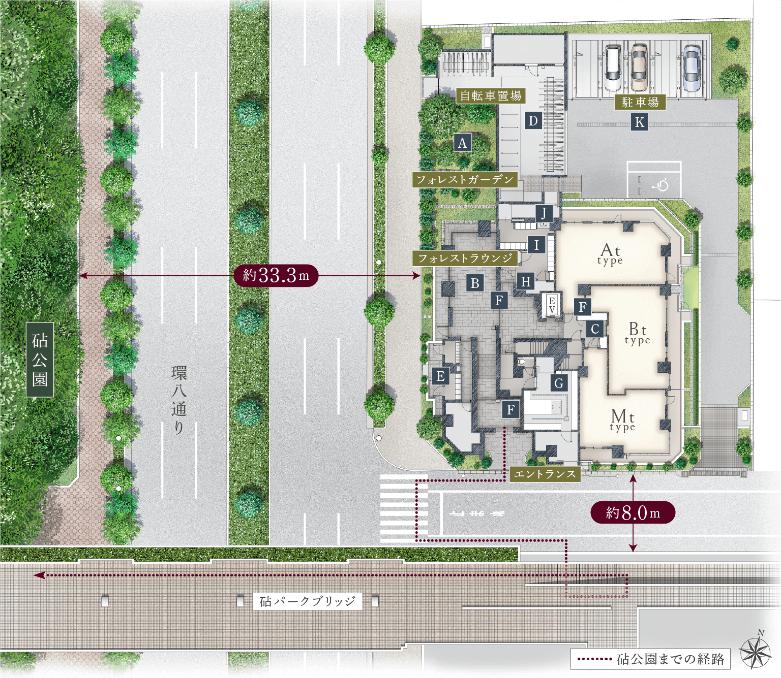 ※掲載の外観完成予想CGは、現地より直線距離約30mからの写真(2025年9月撮影)に建物CGを合成したもので実際とは異なります。建物CGは、計画段階の図面を基に描き起こしたもので実際とは異なります。なお、形状の細部、設備機器等は表現しておりません。また、表現されている植栽は初期の育成期間を経た状態のものを想定して描いており、竣工時は植物の育成を見込んで必要な間隔をとって植えております。家具・調度品等は販売価格に含まれておりません。※掲載の平面概念イラストは、計画段階の図面を基に描き起こし、物件及び周辺建物や公園の関係を概念化したもので、形状・色等は実際とは異なります。なお、形状の細部、設備機器等は表現しておりません。また、表現されている植栽は初期の育成期間を経た状態のものを想定して描いており、竣⼯時は植物の育成を⾒込んで必要な間隔をとって植えております。車両等は販売価格に含まれておりません。共用施設の使用にあたっては、管理規約等に従っていただきます。周辺の環境は変わる可能性があります。