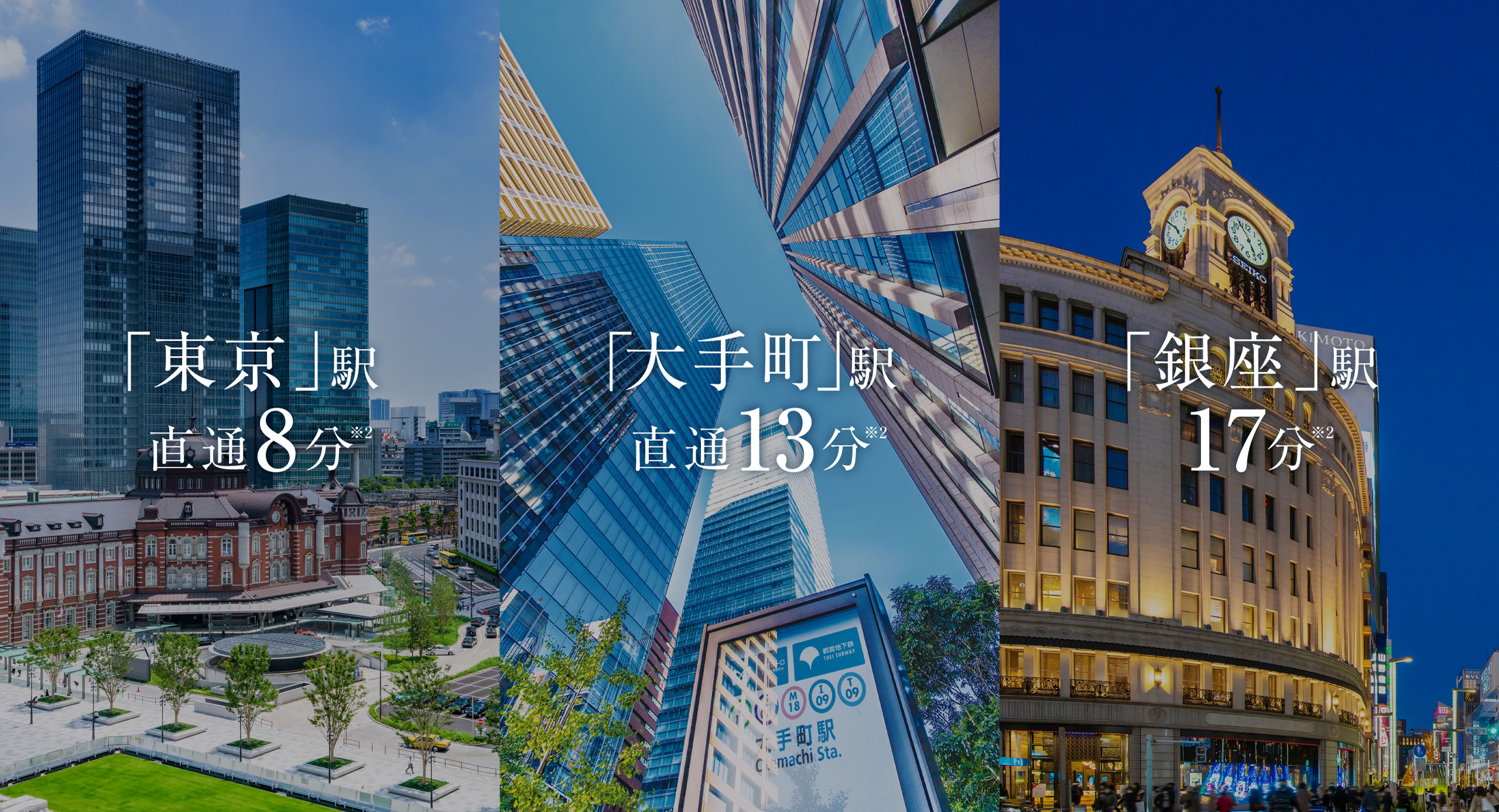 ※2.「東京」駅直通8分/JR総武線快速利用(日中平常時8分)、「大手町」駅直通13分/東京メトロ半蔵門線利用(日中平常時12分)、「銀座」駅17分/JR総武線快速利用、「東京」駅より東京メトロ丸ノ内線乗り換え(日中平常時20分)。掲載の電車所要時間は通勤時、( )内は日中平常時のもので、時間帯により異なります。また、乗り換え・待ち時間を含んでおります。