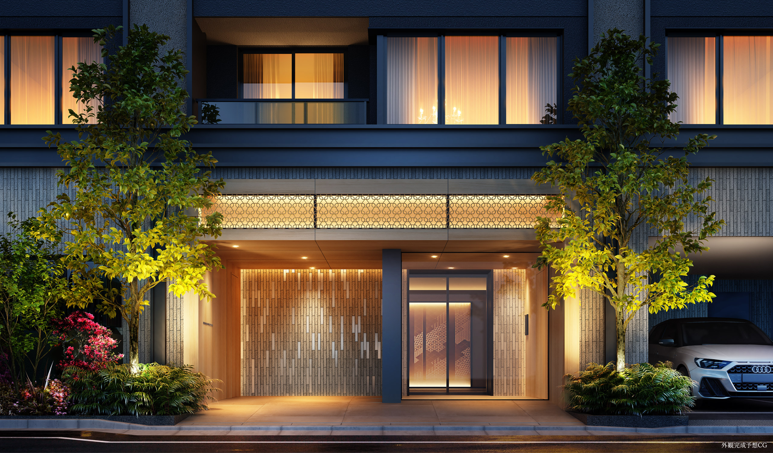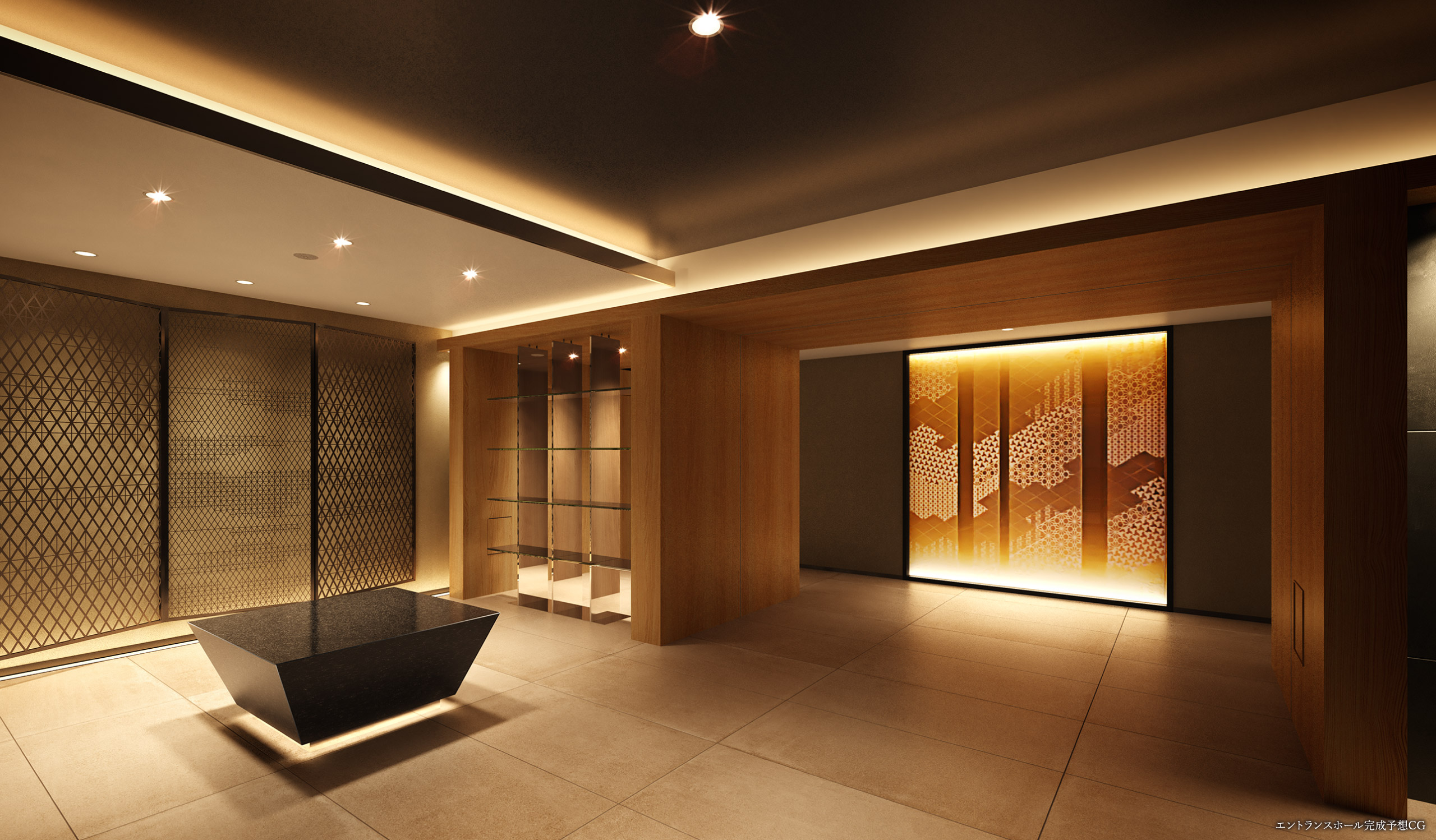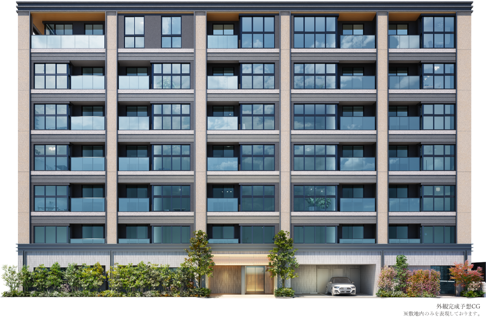 ※掲載の各完成予想CGは計画段階の図面を基に描き起こしたもので建物の形状・色等は実際とは異なります。なお形状の細部、設備機器等は表現しておりません。また全景の完成予想CGは敷地内のみを表現しております。表現されている植栽は初期の育成期間を経た状態のものを想定して描いており、竣工時は植物の育成を見込んで必要な間隔をとって植えております。施工上の都合により、設定位置・樹高・本数等変更となる場合があります。共用施設完成予想CGに表現されている家具・調度品・アート作品等は今後変更となる場合がございます。また、専有部の家具調度品等は販売価格に含まれておりません。