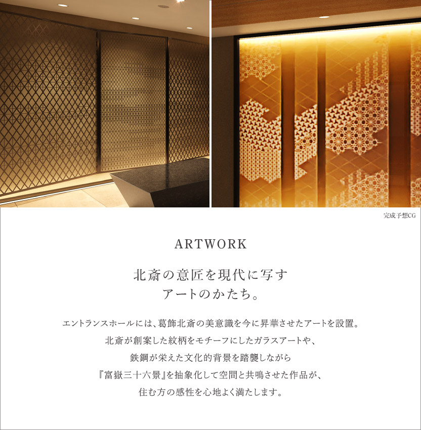 北斎通りの並木の縦景や、葛飾北斎の描いた美を受け継ぐ要素を散りばめた