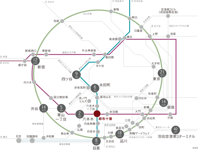 - ※「目黒」駅:直通8分(日中平常時直通7分)/東京メトロ南北線利用、「四ツ谷」駅:直通9分(日中平常時直通8分)/東京メトロ南北線利用、「渋谷」駅:14分(日中平常時17分)/都営地下鉄大江戸線利用、「青山一丁目」駅より東京メトロ半蔵門線乗換え、「東京」駅:21分(日中平常時21分)/東京メトロ南北線利用、「溜池山王」駅より東京メトロ銀座線乗換え、「赤坂見附」駅より東京メトロ丸ノ内線乗換え、「羽田空港第3ターミナル」駅:40分(日中平常時30分)/都営地下鉄大江戸線利用、「大門」駅より都営地下鉄浅草線急行(日中時快特)乗換え