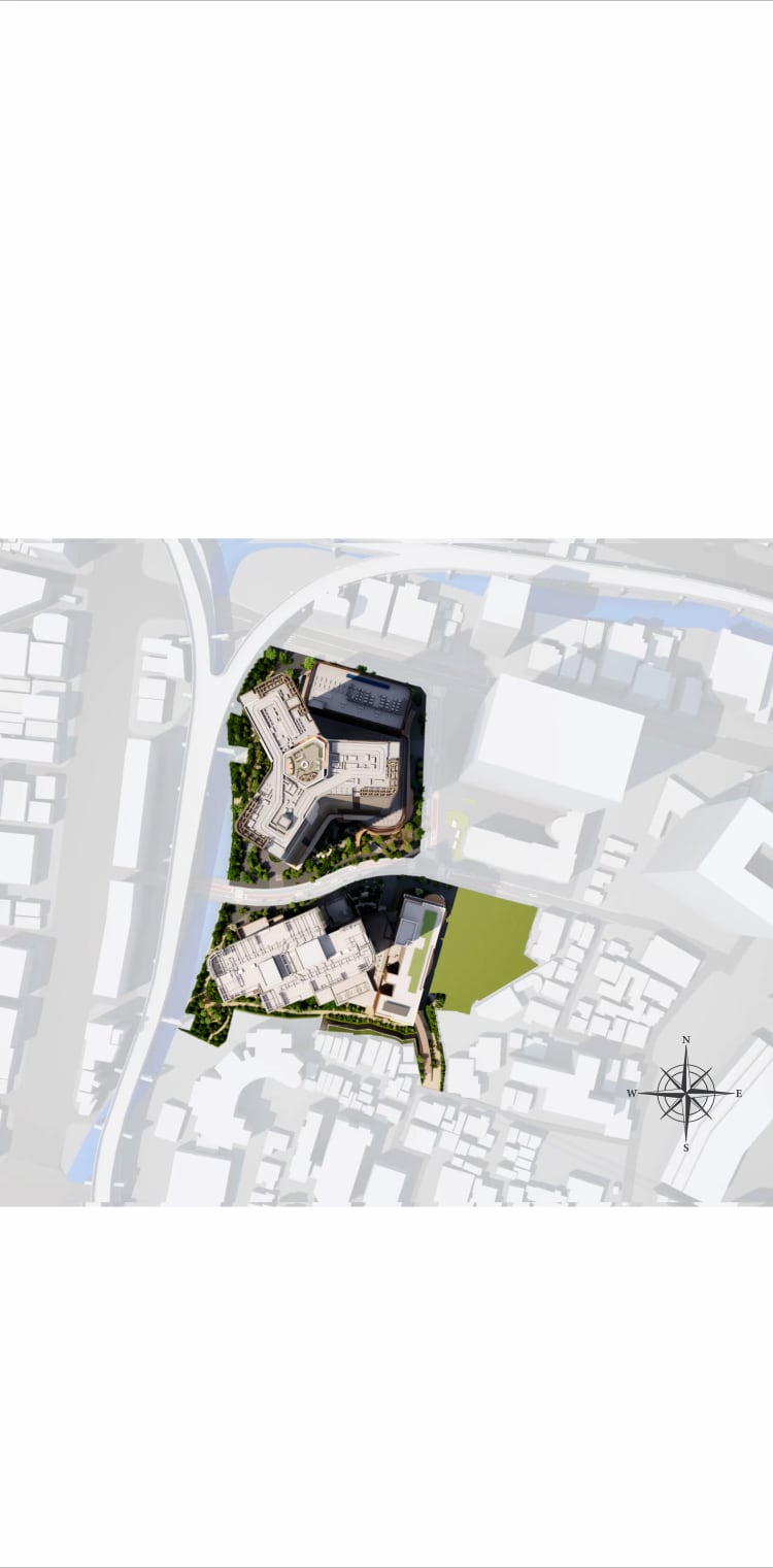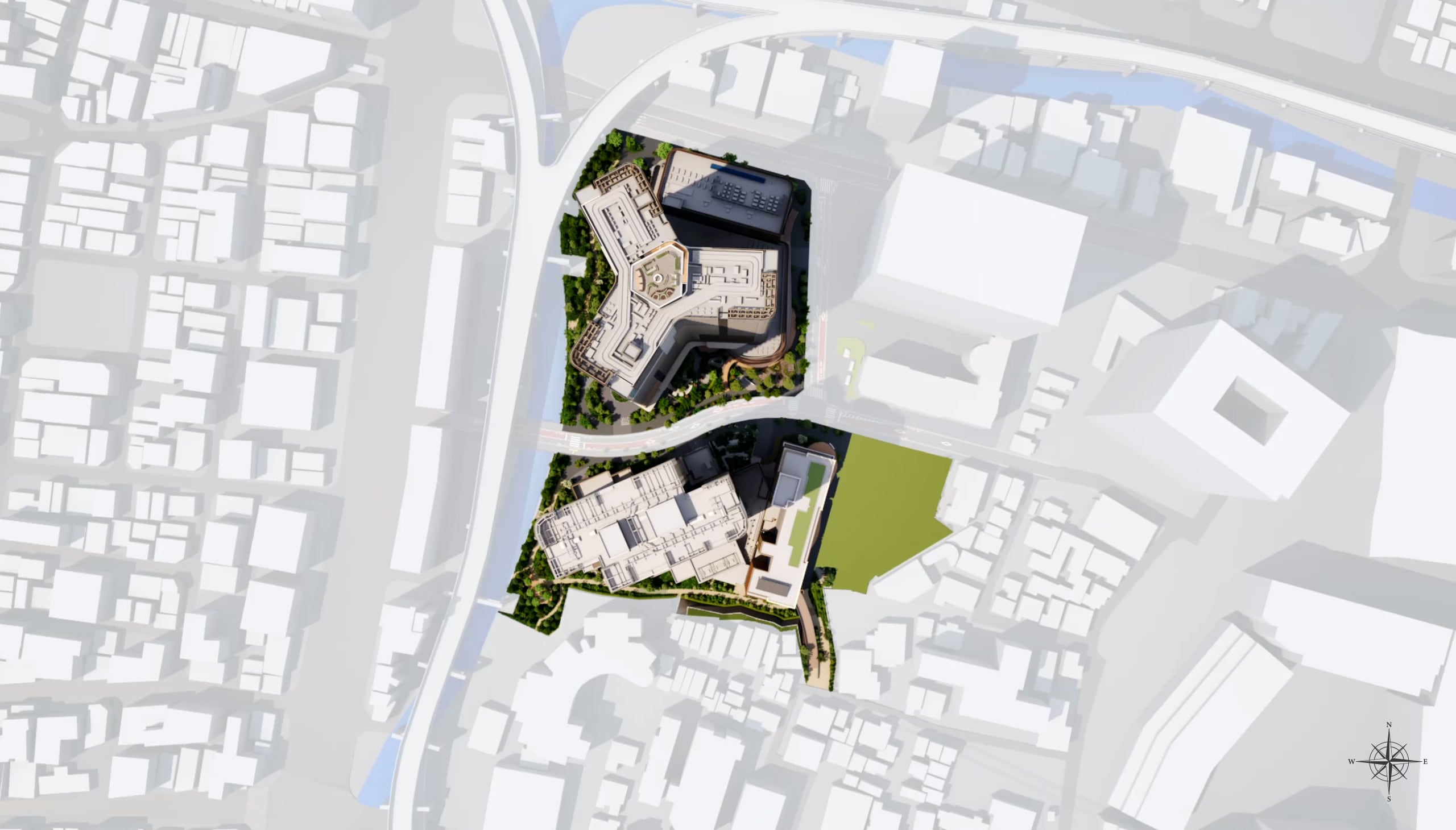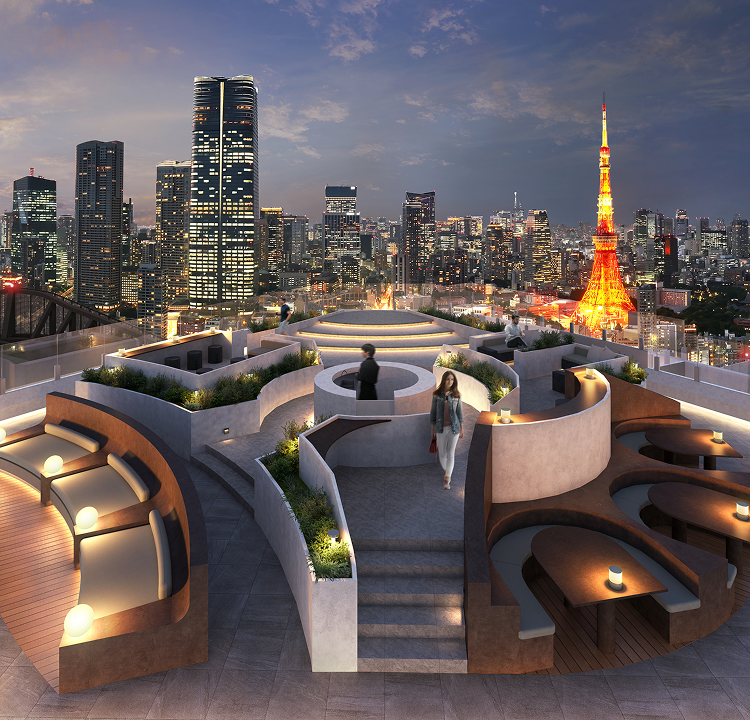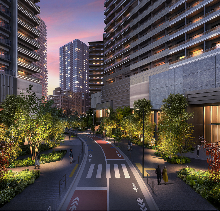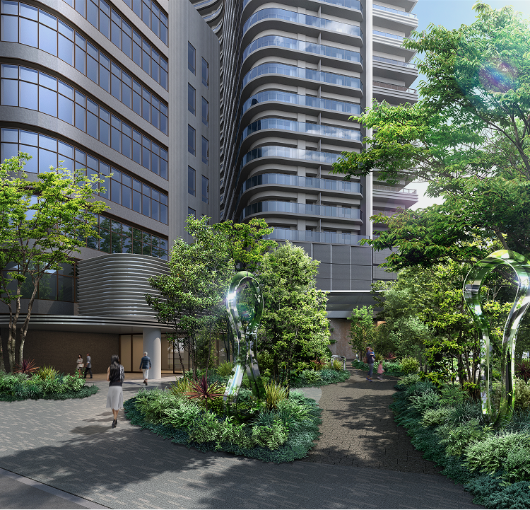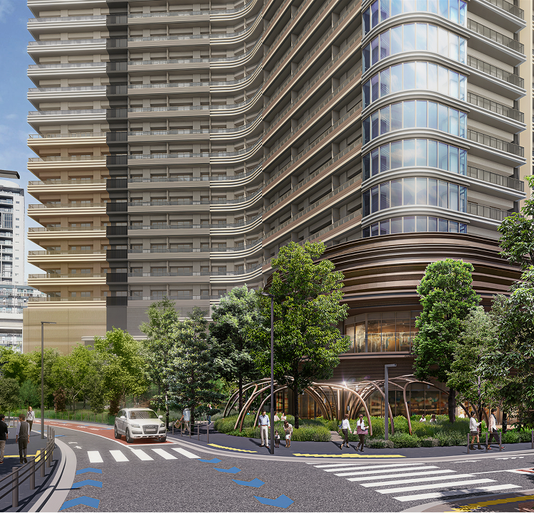 - ※掲載の完成予想CGは、計画段階の図面を基に描き起こしたもので、形状・色等は実際とは異なります。なお、形状の細部、設備機器等は表現しておりません。表現されている植栽は初期の生育期間を経た状態のものを想定して描いており、竣工時は植物の生育を見込んで必要な間隔をとって植えております。施工上の都合により、設定位置・植高・本数等変更となる場合があります。周辺の建物などについては一部簡略化しており、実際とは異なります。