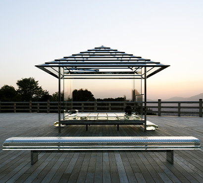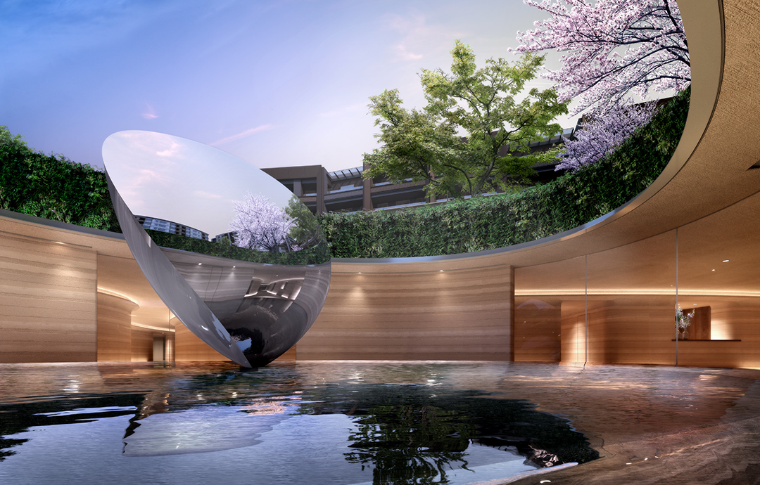 オブジェ「Mirror Cocoon」は訪れる方を中庭へと迎え入れている。